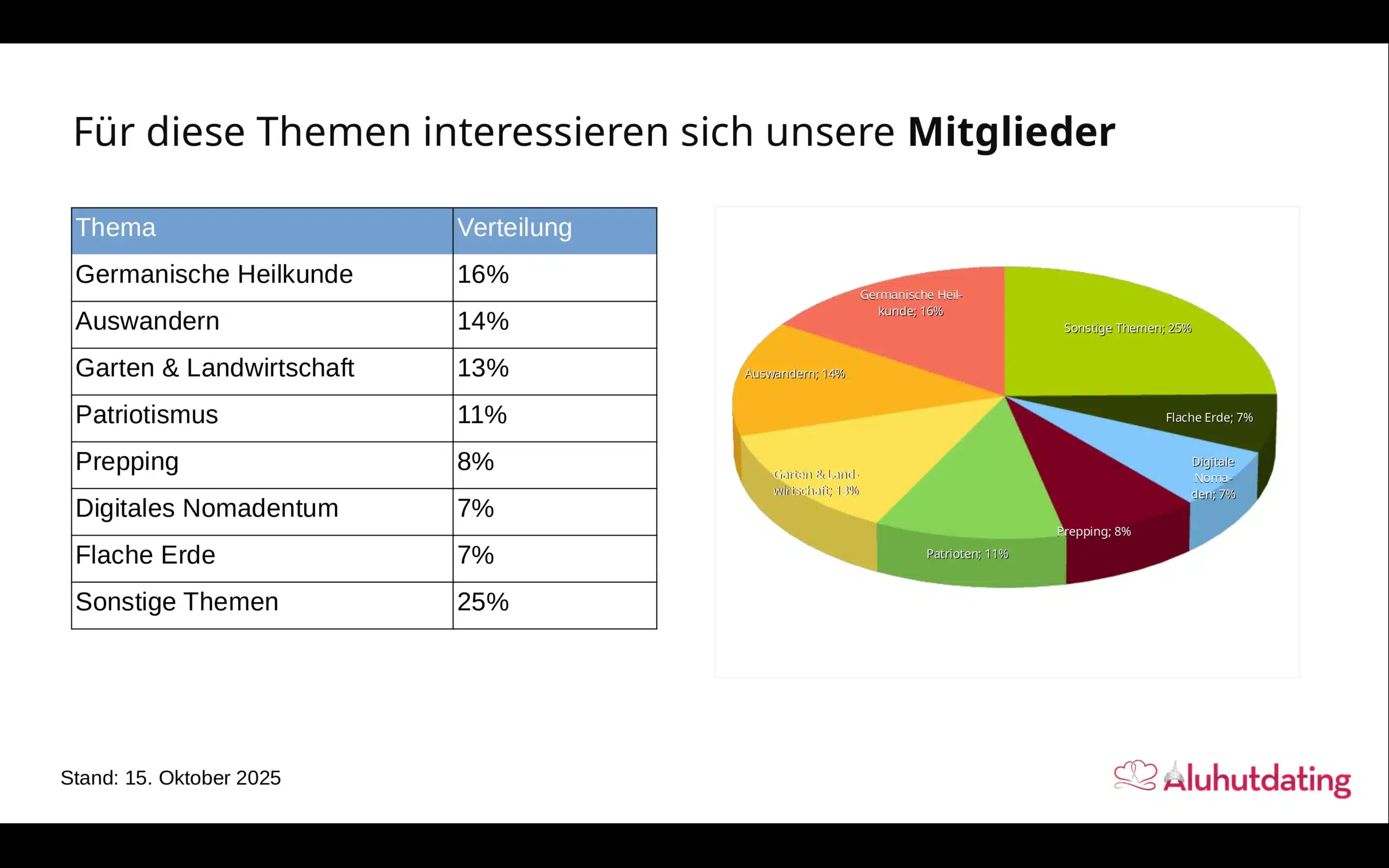 Dann bist du bei Aluhutdating genau richtig. Aluhutdating ist die Plattform für bewusste Menschen, die erkannt haben, in welcher Welt wir wirklich leben und sich gezielt mit Gleichgesinnten verbinden möchten. Egal, ob du auf der Suche nach Freundschaft, Dating oder einer Liebesbeziehung bist – hier findet jeder Kopf seinen passenden Aluhut. Auch das Thema „gemeinsam Auswandern“, steht bei Aluhutdating auf der Agenda.